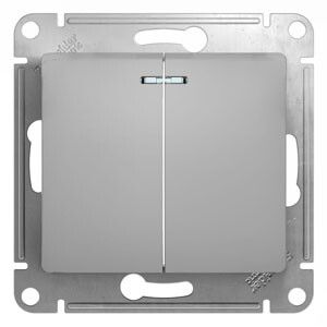 Выключатель 2-клавишный с подсветкой, схема 5а, 10АХ, алюминий совместим с любыми стандартными подрозетниками 68×68 мм и рамками серии GLOSSA. Для монтажа: