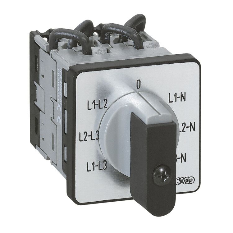 Этот переключатель применяется для коммутации входов вольтметра в трёхфазных сетях 380/400 В. Он позволяет переключать измерительный прибор между шестью возможными парами фаз и одной фазой с нейтралью, не требуя физического подключения проводов каждый раз. Устройство устанавливается на дверцу распределительного щита - так оператор получает безопасный и удобный доступ к измерениям без вскрытия корпуса.