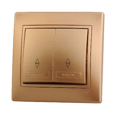 Переключатель проходной 2-клавишный 10А IP20 со вставкой золотистого металла совместим с любыми стандартными подрозетниками диаметром 68 мм. Для работы в схеме проходного управления требуются два таких устройства, установленные в разных точках, и трёхжильный кабель между ними (фаза + два перекидных провода).