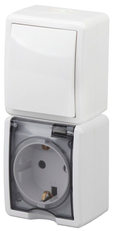 Блок розетка+выкл. верт. IP54, 16A(10AX)-250В, ОУ, Эра Эксперт, белый, 11-7407-01 - Б0036004