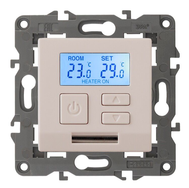 Терморегулятор Эра Elegance с артикулом б0034376 - устройство для точного контроля температуры в системах напольного обогрева и радиаторного отопления. Управляет нагрузкой до 16 А, работает от сети 220 В, оснащён внешним резистивным датчиком и цифровым дисплеем. Подходит для скрытой установки в стену, совместим с рамками серии Elegance.