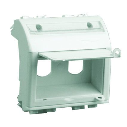 Адаптер для двух оптоволоконных разъемов типа ST, белый, 2 модуля от DKC (ДКС) - компактный элемент для организации точек подключения оптоволоконного кабеля в пассивных распределительных системах. Артикул 76615b предназначен для монтажа в стеновые или настольные корпуса с скрытой установкой, обеспечивает быстрое и надежное соединение разъемов ST.