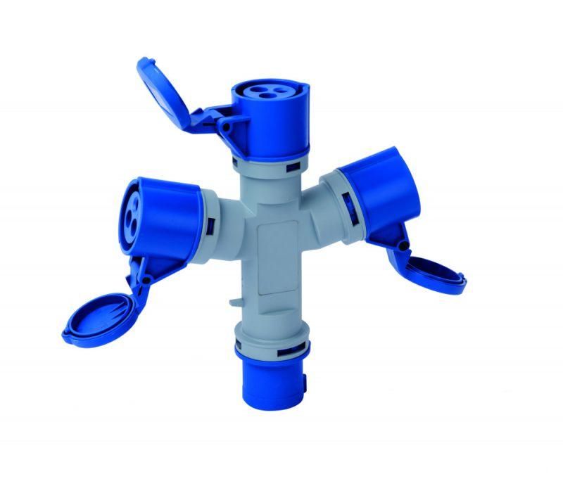 - Адаптер трехлучевой 2P+PE 16A 250V IP44 АП-103 от DEKraft легко заменяет аналоги других брендов - главное, чтобы разъем был CEE 1013.