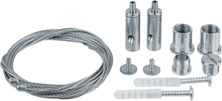 Стальной трос обеспечивает механическую прочность и долговечность. Серый цвет корпуса и элементов позволяет легко интегрировать комплект в любые интерьеры без визуального диссонанса.