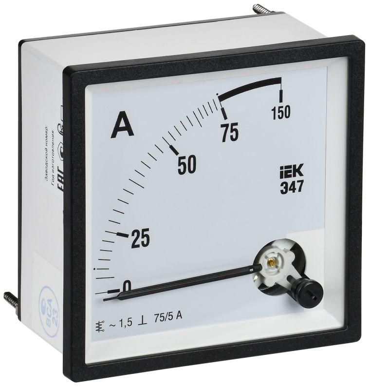 Амперметр Э47 75/5А класс точности 1,5 96×96 мм - аналоговый измерительный прибор от IEK, предназначен для контроля тока в сетях переменного напряжения до 75 А. Устройство монтируется на щиты и работает совместно с трансформаторами тока, что делает его удобным решением для промышленных и бытовых распределительных устройств.