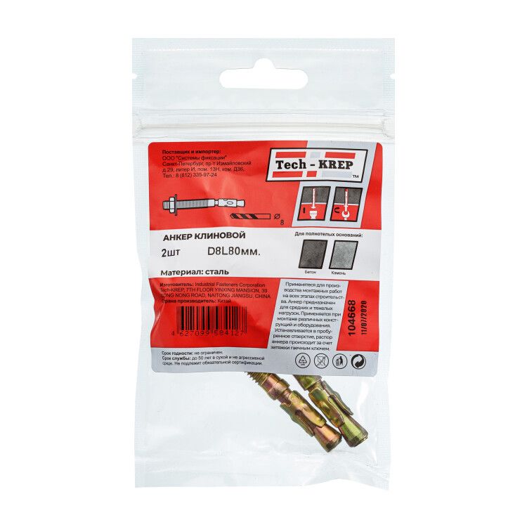 Анкер клиновой 8х80 (2 шт) пакет от Tech-KREP - надежное крепление для тяжелых нагрузок в бетоне и натуральном камне. Упакован по два анкера, идеально подходит для монтажа металлоконструкций, оборудования и ограждений.