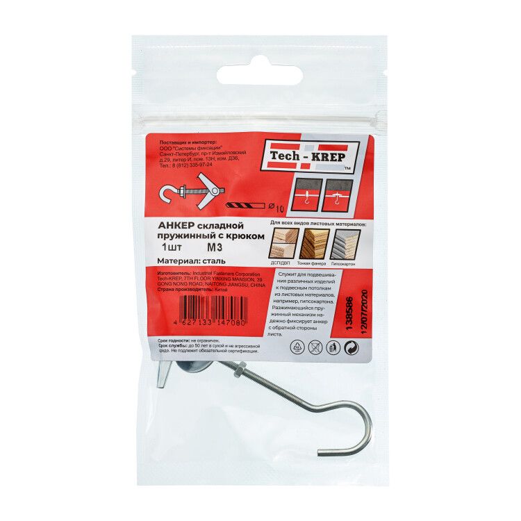 | Анкер складной пружинный с крюком М3 (1 шт) - пакет ( 0,014 кг) | 138586 | Tech-KREP | 13.03.2026 | Под заказ | 48,55 ₽ | уп. | от 30 дней |