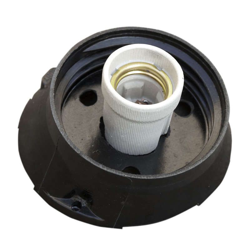 Корпус выполнен из карболита - материала, который выдерживает механические нагрузки, не деформируется при нагреве и не проводит ток. Наклонная форма позволяет регулировать угол падения света без изменения положения всего светильника. Отсутствие стекла упрощает обслуживание и замену лампы, но требует обязательного использования защитных решёток в местах с риском повреждения или попадания посторонних предметов.