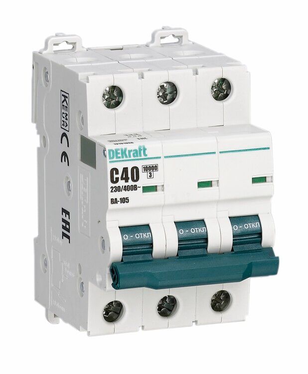 Автоматический выключатель ВА-105 от DEKRAFT - трёхполюсный аппарат на 40 А с характеристикой D и отключающей способностью 10 кА, предназначенный для защиты цепей с высокими пусковыми токами. Устройство монтируется на DIN-рейку, соответствует промышленным и бытовым требованиям, обеспечивает надёжную работу в условиях повышенной нагрузки.