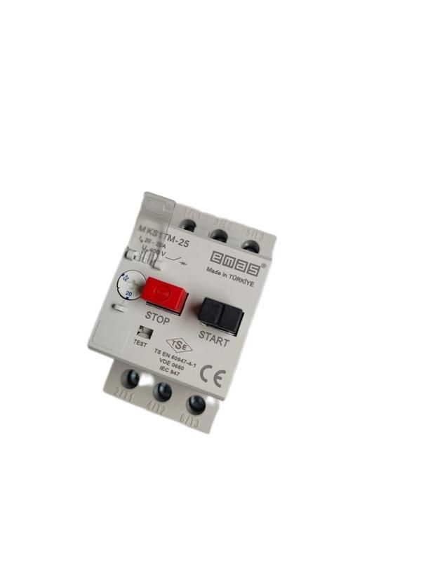 Автоматический выключатель защиты двигателя термомагнитный 20–25 А от бренда EMAS, артикул MKS1TM-25 - устройство для надёжной защиты электродвигателей от перегрузок, коротких замыканий и обрыва фаз. Подходит для установки на DIN-рейку в распределительных щитах промышленного оборудования.