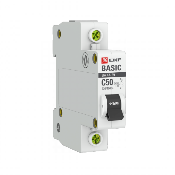 Автоматический выключатель однополюсный 50А С 4,5кА ВА 47-29 Basic защищает электрические цепи от повреждений, вызванных перегрузкой или коротким замыканием. Подходит для использования в жилых домах, офисах, торговых помещениях и на производстве - например, для защиты групповых линий освещения, розеток, нагревательных приборов и маломощного оборудования.