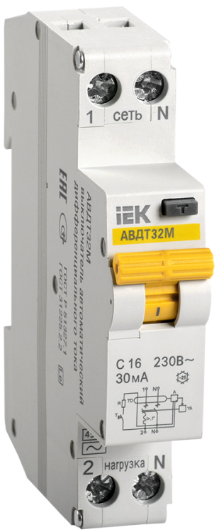 Выключатель автоматический дифференциальный АВДТ32М 1п+N 16А C 30мА тип AC (1 мод) | MAD32-5-016-C-30 IEK