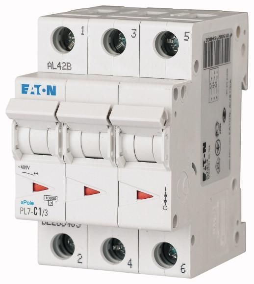 Автоматический выключатель 1А, кривая отключения D, 3 полюс, отключающая способность 10 кА PL7-D1/3 - 165136 EATON