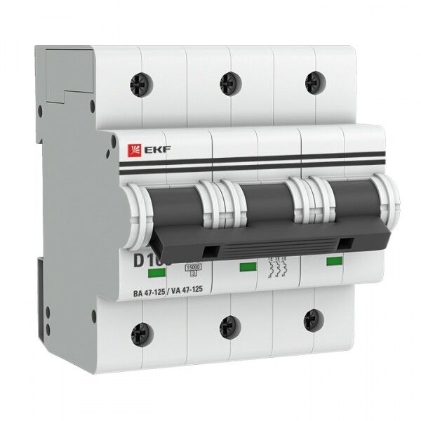 Автоматический выключатель ВА 47-125 - трёхполюсный модульный аппарат с номинальным током 100 А и характеристикой срабатывания D, предназначен для защиты электрических цепей от перегрузок и коротких замыканий. Произведён бренда EKF, артикул mcb47125-3-100d, подходит для установки на DIN-рейку в бытовых и промышленных объектах.