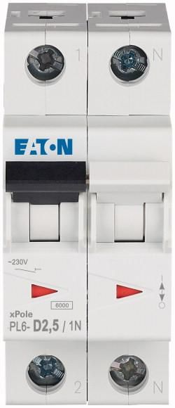 Автоматический выключатель 2,5А, кривая отключения D, 1+N полюс, отключающая способность 6 кА PL6-D2,5/1N - 164942 EATON