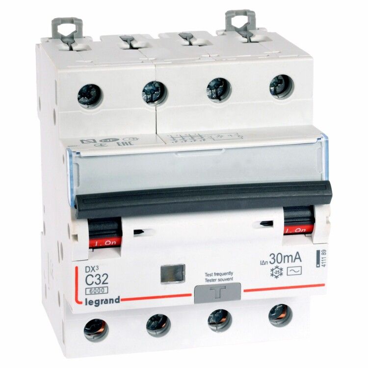 Выключатель автоматический дифференциального тока 4п C 32А 30мА тип AC 10кА DX3 4мод. Leg 411189 Legrand - это механический коммутационный аппарат, предназначенный для включения и отключения токов при нормальных условиях эксплуатации, а также размыкания контактов в случае, когда значение дифференциального тока достигает заданной величины в определенных условиях.