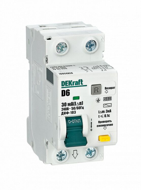 Автоматический выключатель дифференциального тока АВДТ 1Р+N 6А 30мА тип AC х-ка D ДИФ-103 4.5кА | 16059DEK DEKraft APC