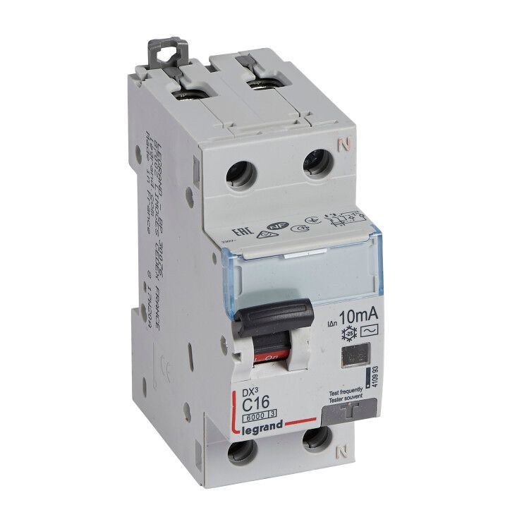 Выключатель автоматический дифференциального тока 2п (1P+N) C 16А 10мА тип AC 6кА DX3 2мод. Leg 410993 Legrand - это механическое коммутационное устройство, предназначенное для включения и отключения токов при нормальных условиях эксплуатации, а также размыкания контактов в случае, когда значение дифференциального тока достигает заданной величины в определенных условиях.