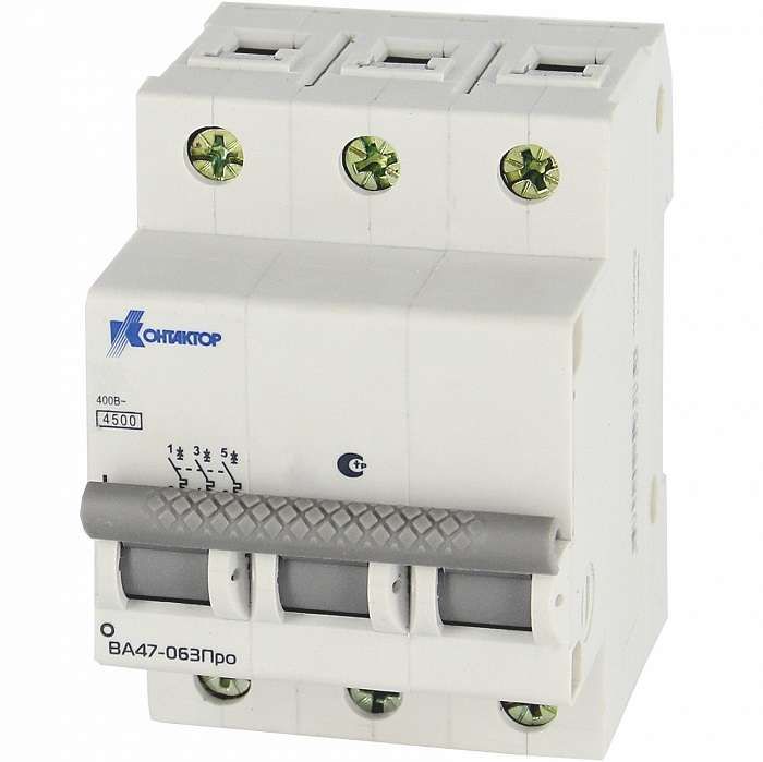 Автоматический выключатель ВА47-063 от Контактор Ульяновск - трёхполюсный модульный прибор для защиты электрических цепей от перегрузок и коротких замыканий. Подходит для установки на DIN-рейку в щитах жилых, офисных и промышленных объектах. Номинальный ток 4 А, отключающая способность 4,5 кА, характеристика расцепления C.
