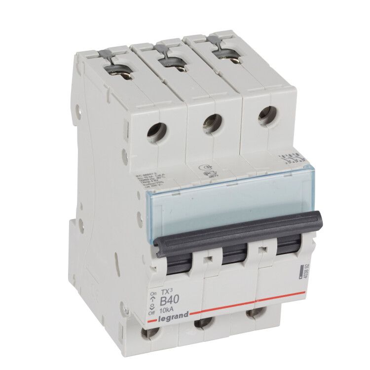 Автоматический выключатель Legrand TX3 с артикулом 403892 - трёхполюсный коммутационный аппарат на 40 А, предназначенный для защиты электрических цепей от перегрузок и коротких замыканий. Устройство монтируется на DIN-рейку и подходит для бытовых и аналогичных объектов с переменным током 400 В.