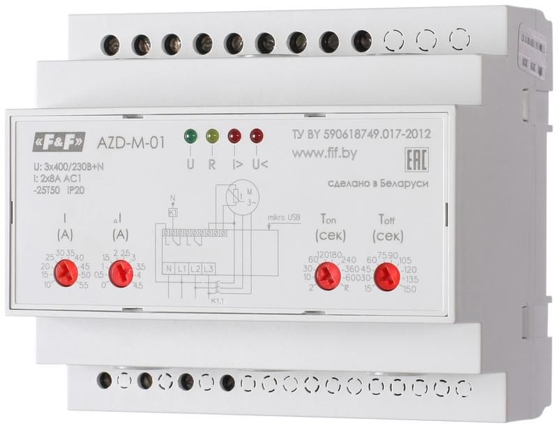 Реле защиты двигателя многофункциональное AZD-M-02 (защита 3-х фазных двигателей мощностью до 2.2кВт; и для работы с внешними ТТ; USB порт; 6 модулей; монтаж на DIN-рейке) F&F EA05.004.004 Евроавтоматика