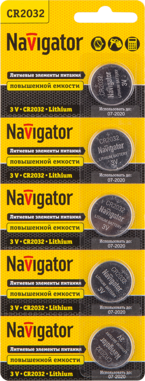 Элемент питания литиевый CR2032 от бренда Navigator, артикулы 94765 и 17014, предназначен для долговременного питания маломощных устройств. Каждый элемент обеспечивает стабильное напряжение 3 В и рассчитан на работу в широком диапазоне температур - от -30C до +60C. Упакованы по 5 штук в блистере, что удобно для запаса и замены.
