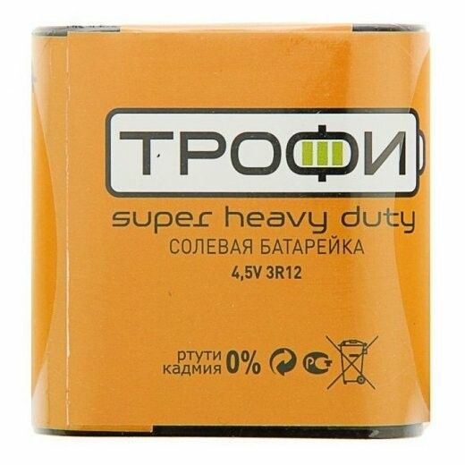 Элемент питания солевой 3R12-1S "квадрат" ТРОФИ - одноразовый источник тока с плоской формой корпуса, предназначенный для устройств с ограниченным пространством. Батарейка подходит для недорогих бытовых приборов, где важна компактность, а нагрузка невелика.