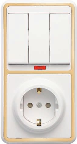 - Объединяет три функции - выключатель + розетка + подсветка - в одном устройстве, снижает количество точек установки