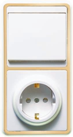 Блок БКВР-034 от Кунцево-Электро - совмещённый элемент управления: одноклавишный выключатель и евророзетка с шторками в золотом исполнении. Подходит для скрытой установки в жилых и офисных помещениях, где требуется компактное решение для управления светом и подключения бытовой техники.