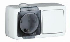 Блок открытой установки, брызгозащищенный, розетка с заземляющим контактом и шторками+одноклавишный выключатель, цвет белый | БА 16-221 HEGEL