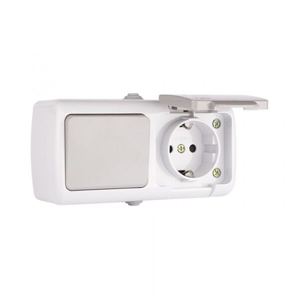 Блок розетка 1-местная 16А с заземлением с крышкой + одноклавишный выключатель IP54 серый используется там, где требуется защита от пыли и брызг воды - в гаражах, мастерских, на дачах, в подсобных помещениях, на производстве и при наружной установке под навесом. Подходит для питания переносного оборудования: болгарок, насосов, компрессоров, светильников. Выключатель позволяет легко отключить питание устройства без необходимости доставать штепсель из розетки.