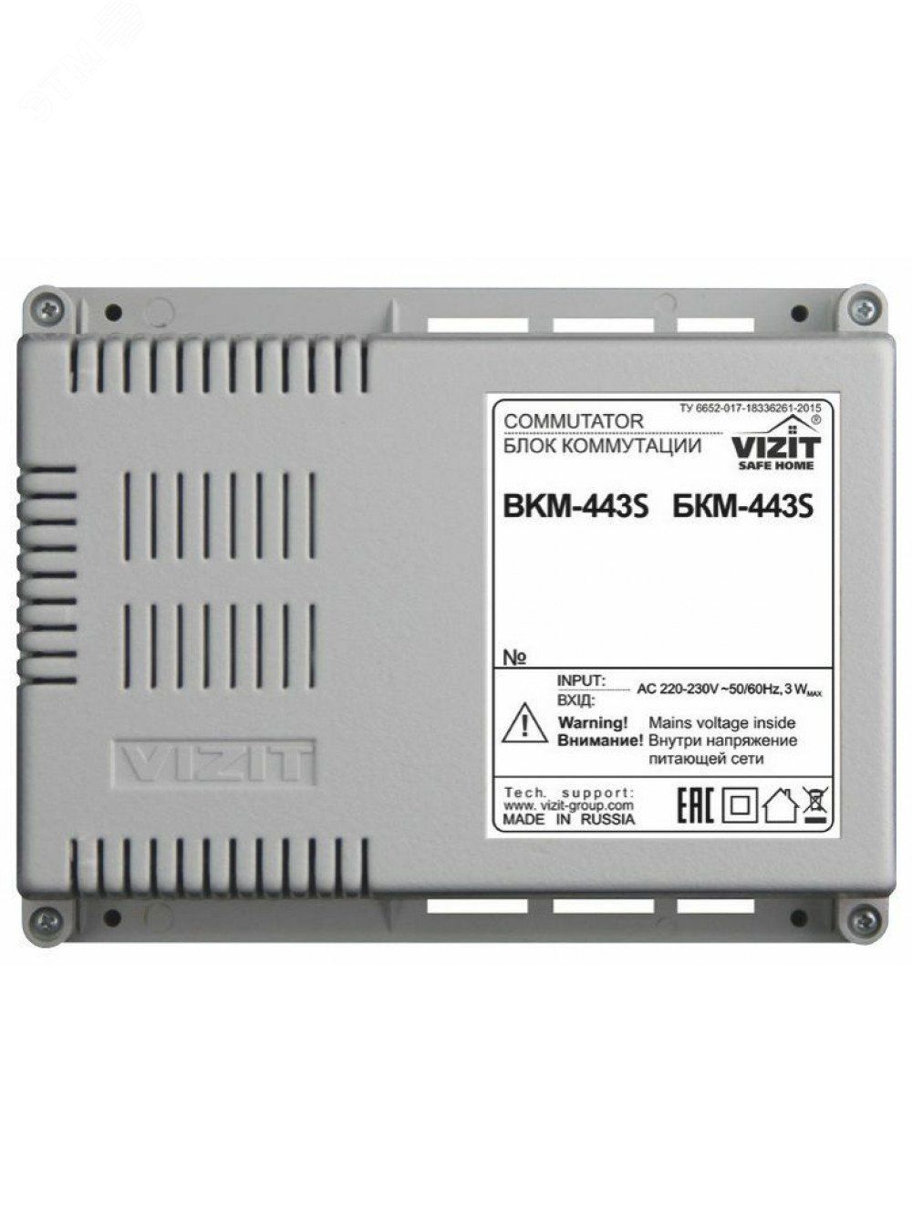 Блок коммутации и питания монитора БКМ-443S. Возможность подключения 3-х мониторов VIZIT-M428C, М441М, -М442M, -М457М, -М467М, -М468М, -М71М УКП. Подключение БВД, кнопки - Звонок дополнительной телекамеры или БВД-403СРО. Функция -интерком- при использовании VIZIT-М442M, -М468М. Встроенный импульсный источник (187-242VAC) для электромеханических замков (защёлок). Рекомендуется использовать совместно с монтажным боксом VIZIT-MB1 (МВ1А, МВ1Р,MB2Р).