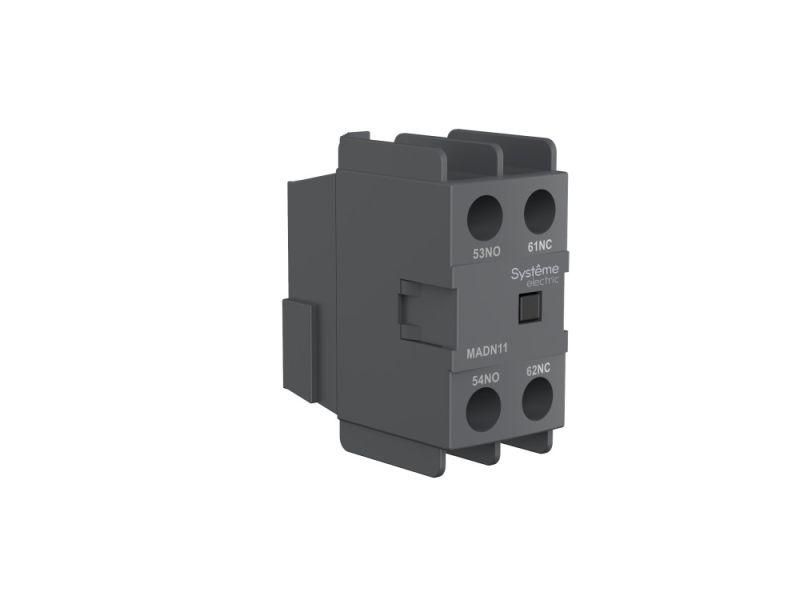 Блок дополнительных контактов MC1D 2 нормально открытых фронтальный монтаж - компактное устройство для расширения функционала контакторов серии SystemePact. Он позволяет добавить два вспомогательных контакта в цепи управления и сигнализации, обеспечивая надёжную коммутацию при малых токах. Артикул madn20 соответствует модели от бренда SE (Systeme), предназначенной для промышленного оборудования.