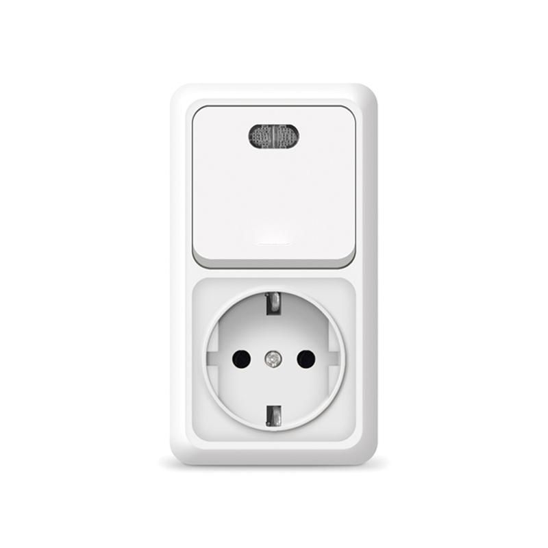 Блок выключатель одноклавишный с подсветкой + розетка с заземлением вертикальный белый от Universal (арт. О0039) - компактное совмещенное устройство, объединяющее управление освещением и подключение бытовой техники в одном корпусе. Подходит для открытой установки в жилых и офисных помещениях.