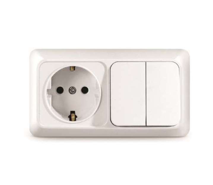 Блок выключатель двуклавишный + розетка с заземлением горизонтальный белый (О0033) предназначен для одновременного управления двумя группами светильников (например, потолочным и ночным освещением) и подключения одного устройства через розетку с заземлением. Подходит для установки в квартирах, домах, офисах, учреждениях - там, где требуется удобное расположение выключателя и розетки рядом. Устройство рассчитано на постоянную эксплуатацию в сухих внутренних помещениях.