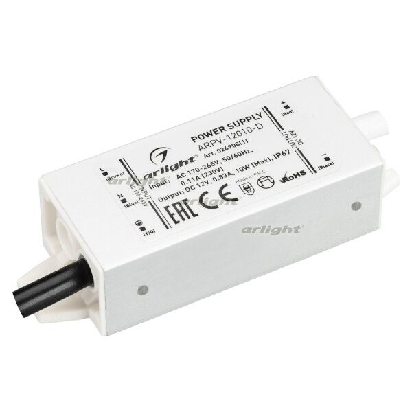 Блок питания Arlight 026908(1) - герметичный источник питания 12 В, 10 Вт с металлическим корпусом IP67, предназначенный для надёжного питания светодиодных устройств в сложных условиях эксплуатации.
