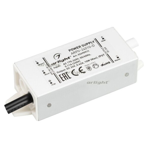 Блок питания Arlight 026909(1) - компактный металлический источник питания 24 В, 10 Вт с защитой IP67, предназначенный для надёжного питания светодиодных лент и других маломощных устройств в сложных условиях.