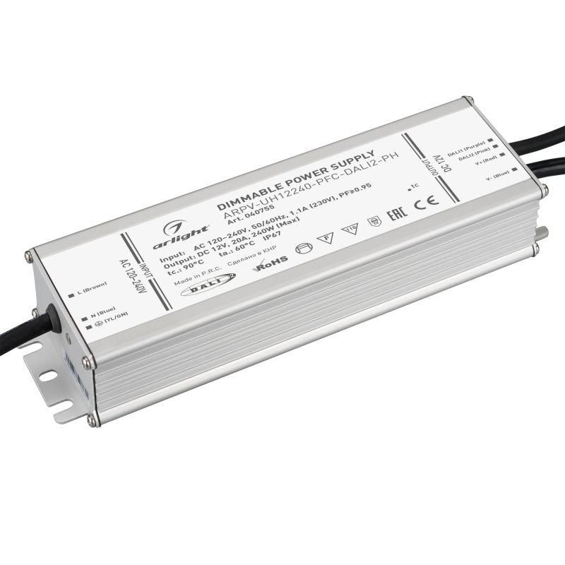 Блок питания Arlight 040755 серии ARPV-UH - это герметичный диммируемый источник питания 12 В/20 А на 240 Вт с управлением по протоколу DALI2 и коэффициентом мощности 0.95. Подходит для уличного и промышленного освещения, где важны надежность, точное регулирование яркости и работа в экстремальных условиях.