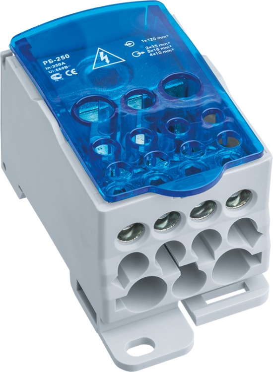Блок распределительный NBB-DB-250 устанавливается на стандартную DIN-рейку шириной 35 мм. Для монтажа достаточно защёлкнуть корпус на рейке - никаких болтов или сверления не требуется. Каждый контакт рассчитан на подключение одного провода сечением до 120 мм2. Подходящие провода должны иметь подходящую опрессовку или наконечники, чтобы обеспечить плотный контакт. Убедитесь, что все провода затянуты моментом, рекомендованным производителем - переусердствовать нельзя, чтобы не повредить латунные элементы.