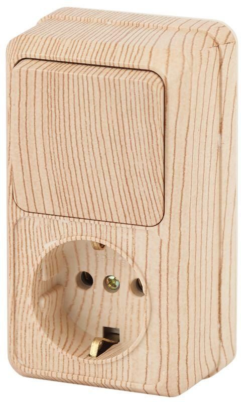 Блок розетка с выключателем вертикальный 10(16)А-250В, IP20, открытая установка, сосна монтируется на стену с помощью винтового крепления. Для установки требуется предварительно протянуть два провода: фазу и ноль для розетки, и третий - для коммуникации выключателя (фаза на светильник). Монтаж выполняется после отключения питания. Габариты позволяют использовать стандартные подрозетники для открытой установки. Учитывайте, что глубина корпуса 45 мм требует свободного места за отделкой стены.