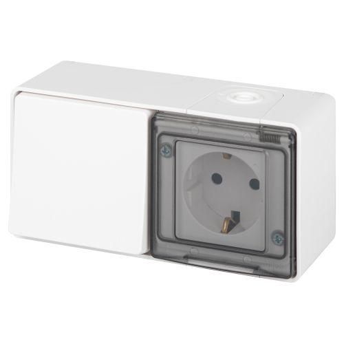Блок розетка с выключателем 1-клавишным IP55, 16A(10AX)-250В, открытый установочный, белый предназначен для монтажа на ровную поверхность - деревянную, металлическую, бетонную или кирпичную. Для установки требуются два винта (в комплект не входят). Кабель подключается к клеммам: фаза, ноль, земля - все контакты помечены. Максимальное сечение жилы - 2,5 мм2. Не рекомендуется использовать с многожильными проводами без наконечников. Устройство не имеет встроенной защиты от перегрузки - необходимо применять автоматический выключатель в распределительном щите.