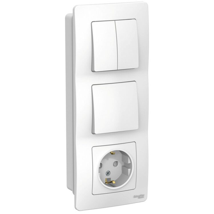 Блок Systeme Electric BLANCA предназначен для внутренней проводки в жилых и общественных помещениях. Он сочетает в себе три функциональных элемента: розетку на 16 А с заземлением и защитными шторками, один одноклавишный и один двухклавишный выключатель. Подходит для управления двумя группами освещения из одного места - например, потолочным светом и бра, или светом в коридоре и на лестнице. Розетка обеспечивает питание устройств до 16 А, что достаточно для фена, пылесоса или зарядки оборудования.