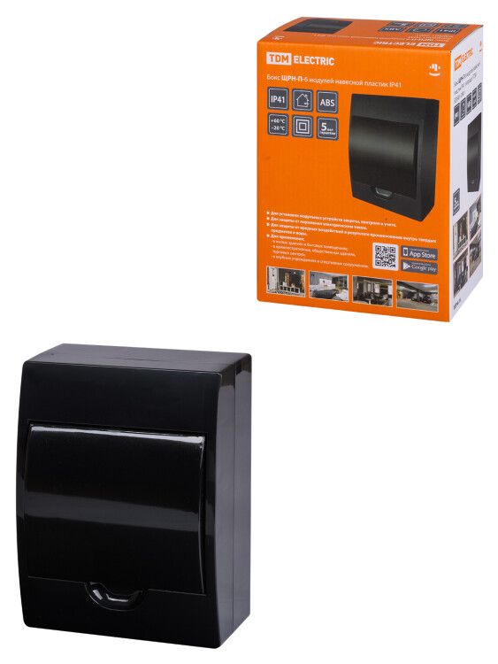 Бокс навесной ЩРН-П-6 модулей пластик IP41, Антрацит от TDM ELECTRIC - это компактный корпус для установки модульного оборудования в условиях, где требуется базовая защита от случайного контакта и попадания пыли. Подходит для распределительных щитов в жилых, административных и производственных зданиях.