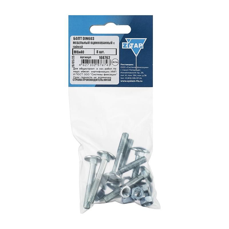 | Болт мебельный с гайкой М6х40 DIN 603 оцинк. (уп.8шт) Tech-Krep/Zitar 108762 | 15.03.2026 | Под заказ | 77,3 ₽ | уп. 8 шт. | от 13 дней |
