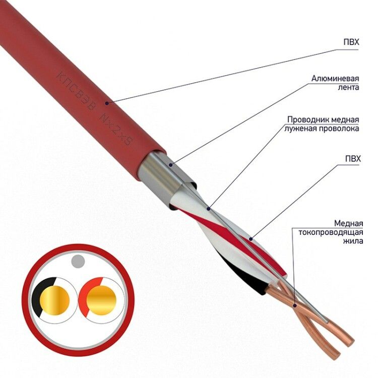 КПСВЭВ 1х2х0,75 - кабель экранированный для пожарной сигнализации, с 2 медными однопроволочными жилами сечением 0,75 миллиметров квадратных в ПВХ изоляции и оболочке не распространяющий горение при одиночной прокладке и экраном из алюмолавсановой ленты с проводником из медной луженой проволоки.