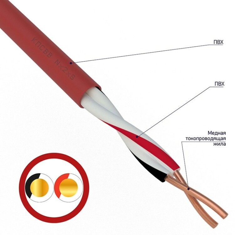 КПСВВ 1х2х0.75 - кабель для пожарной сигнализации, с двумя медными однопроволочными жилами сечением 0,75 миллиметров квадратных в ПВХ изоляции и оболочке не распространяющий горение при одиночной прокладке.