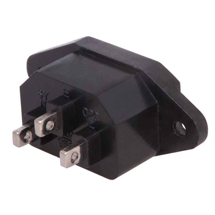 Штекер рассчитан на установку в корпус с отверстием подходящего диаметра - обычно 20–22 мм. Для монтажа необходимо просверлить отверстие в стенке корпуса, вставить штекер и затянуть два боковых винта. Кабель питания с вилкой стандарта IEC 60320 C13 подключается спереди, а провода от внутреннего оборудования - сзади, к клеммам. Убедитесь, что материал корпуса достаточно толстый для плотного прилегания винтов.