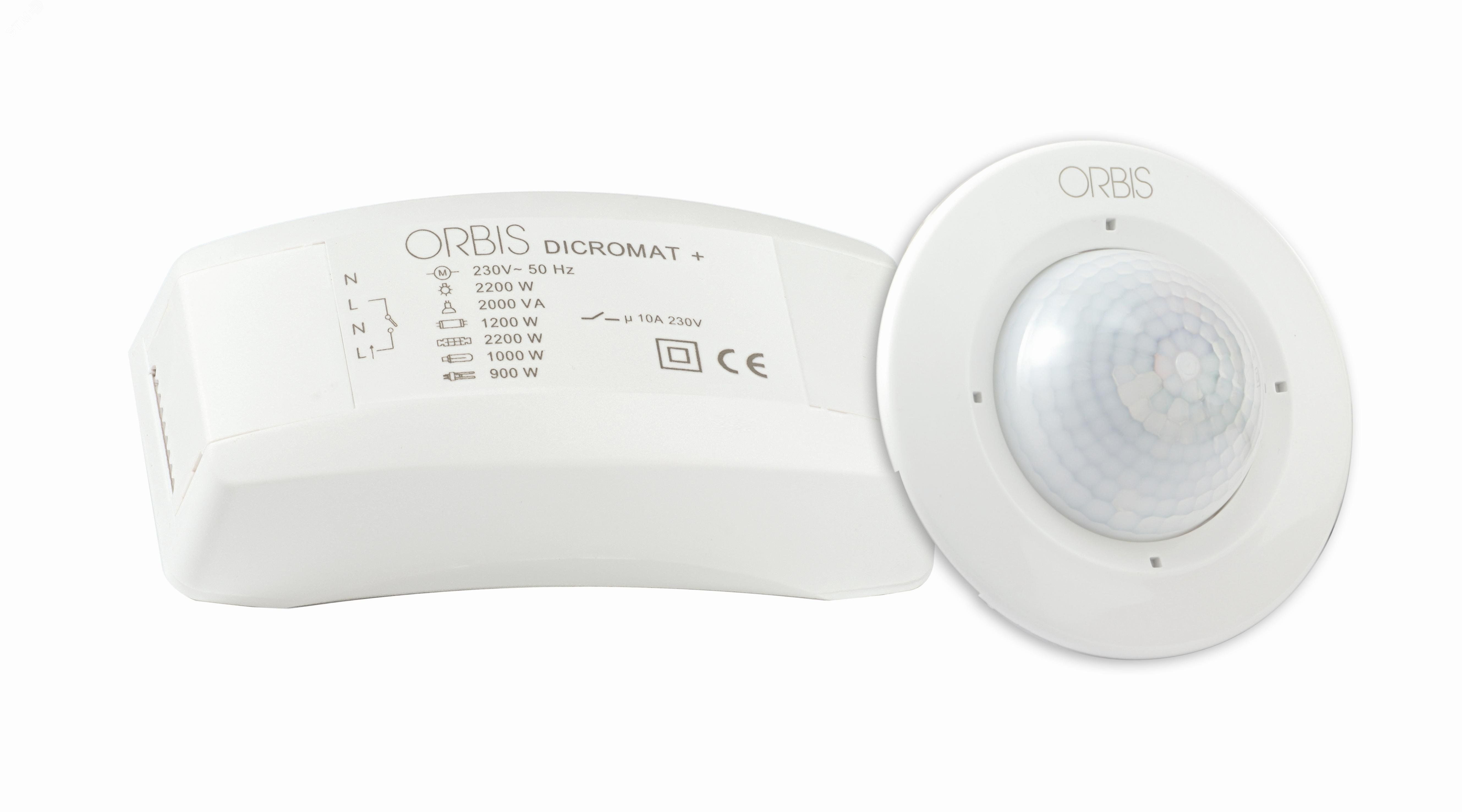 Датчик присутствия DICROMAT-2+CR 230В от бренда ORBIS - это пассивный инфракрасный датчик с круговым обзором, предназначенный для автоматического управления освещением в помещениях с постоянным движением людей. Артикул ob134612 подходит для скрытой установки в потолках и используется совместно с другими сенсорами DICROMAT SENSOR+ через единый блок питания.