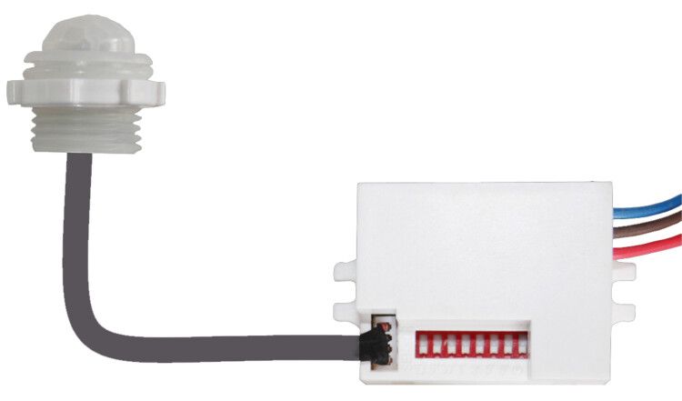 Датчик движения инфракрасный скрытый подключается последовательно в цепь освещения - между фазным проводом и лампой. Монтаж универсальный: можно закрепить на потолке или стене через стандартную монтажную коробку. Для работы требуется только фаза и ноль - заземление не обязательно. Клеммы рассчитаны на медные жилы сечением до 1,5 мм2. Не подключайте к датчику более 100 Вт суммарной нагрузки - даже если лампы в сумме дают 800 Вт, он просто не справится и перегорит. Пример: можно запитать одну лампу 100 Вт или десять LED-ламп по 10 Вт каждая.