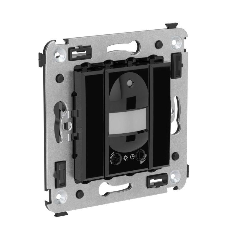 Датчик движения в стену Черный квадрат DKC устанавливается вместо стандартного выключателя. Для монтажа требуется подрозеточная коробка глубиной не менее 45 мм (совместим с коробкой 59301). Крепление осуществляется с помощью специального каркаса с лапками (артикул 4400802) и двух саморезов - обеспечивает плотную фиксацию даже в старых коробках.